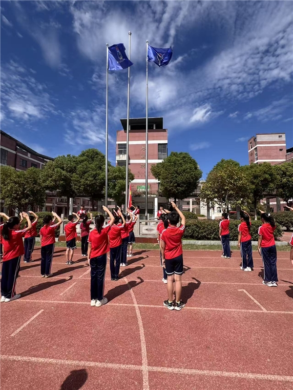 伴随着激昂雄壮的《义勇军进行曲》,五星红旗在朝阳的映照下冉冉升起,全体师生身着整齐着装,肃立注目,高唱国歌,目光追随着国旗升至旗杆顶端,心中涌动着对祖国的无限崇敬与热爱。迎风飘扬的国旗,不仅是国家尊严与民族精神的象征,更在这一刻唤醒了每一位师生对历史的深刻记忆。