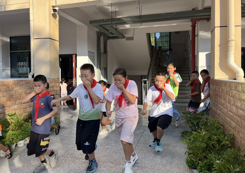 上午第二节课结束后,随着急促的警报声响起,老师迅速组织学生们用湿毛巾或手捂住口鼻,弯腰低姿,有序走出教室,按照预先指定的路线,快速从教学楼撤离至运动场空旷区域,疏散过程做到了快速、安全、有序。