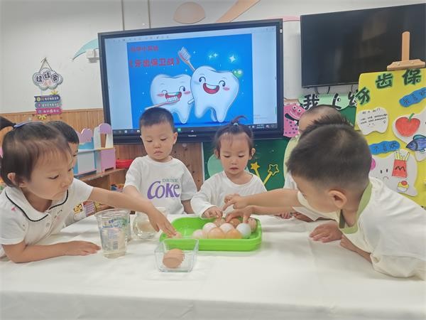 孩子们发现醋里的蛋壳表面变得粗糙、发软。“原来酸酸甜甜的饮料真的会伤害牙齿!”孩子们直观地明白了不良饮食对牙齿的危害,纷纷表示要少喝甜饮料。