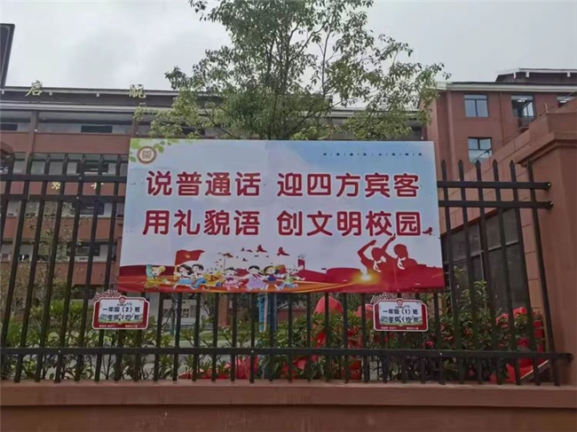 校园各处早已被浓郁的推普气息包裹。校门口的电子屏滚动播放“说普通话,用文明语,做文明人”“规范汉字书写,传承中华文化”等醒目标语,传递推普理念;教学楼走廊、宣传栏张贴着色彩明快的推普海报。全方位的视觉宣传,让“说规范话、写规范字”的意识悄然融入校园的每一个角落。