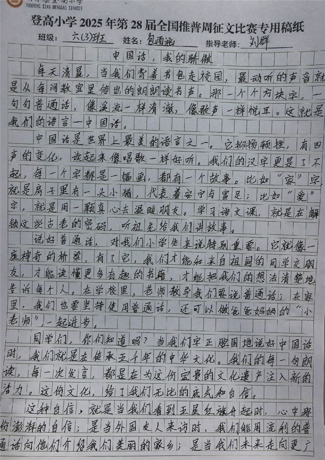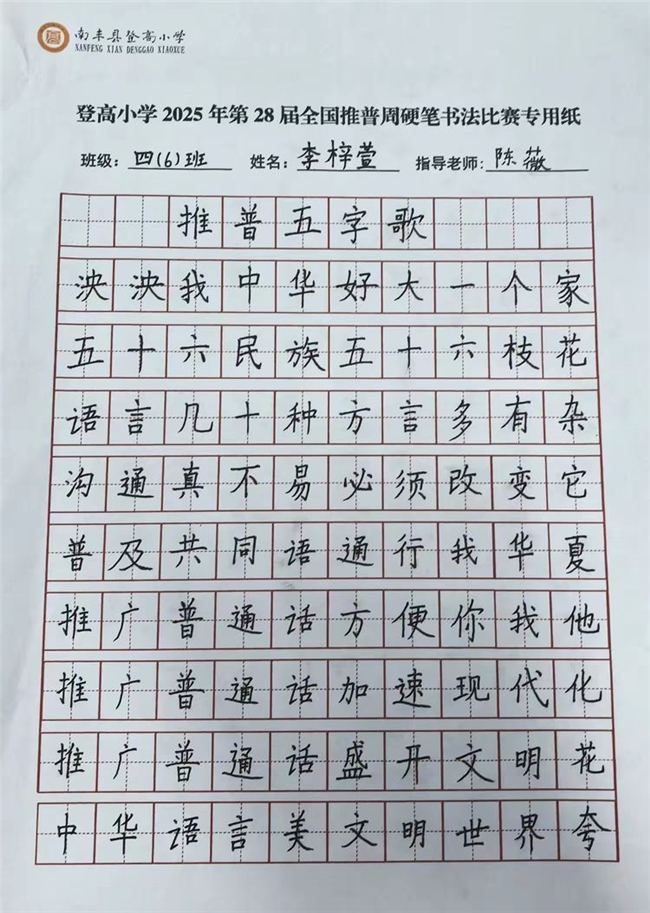 推普周的活动虽暂告一段落,但推广普通话、书写规范字的行动永不停歇。登高小学将以此次活动为契机,持续营造“说普通话、写规范字、用文明语”的良好氛围,让中华语言文化的种子在孩子们心中生根发芽,伴随他们成长远航!(曾维)