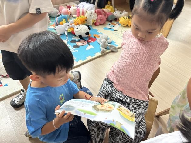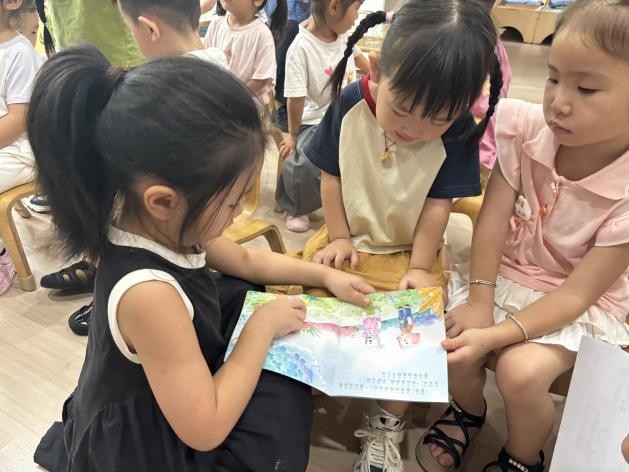 活动中,大班孩子们化身“小老师”,主动拉起弟弟妹妹的手,坐在绘本角共同翻阅《我爱幼儿园》《大卫上学去》等趣味绘本。他们用稚嫩却认真的声音讲述故事,时不时轻轻拍拍紧张的弟弟妹妹,分享自己刚入园时的小妙招。小班萌娃们渐渐放下拘谨,跟着哥哥姐姐的节奏沉浸在绘本世界里,脸上露出灿烂笑容。