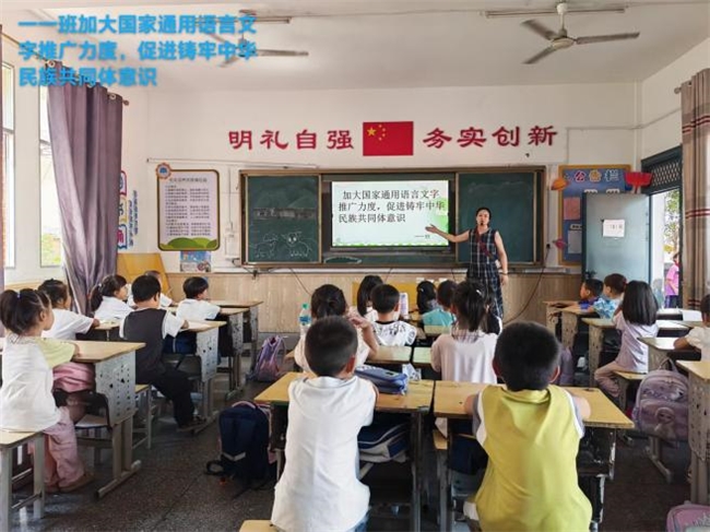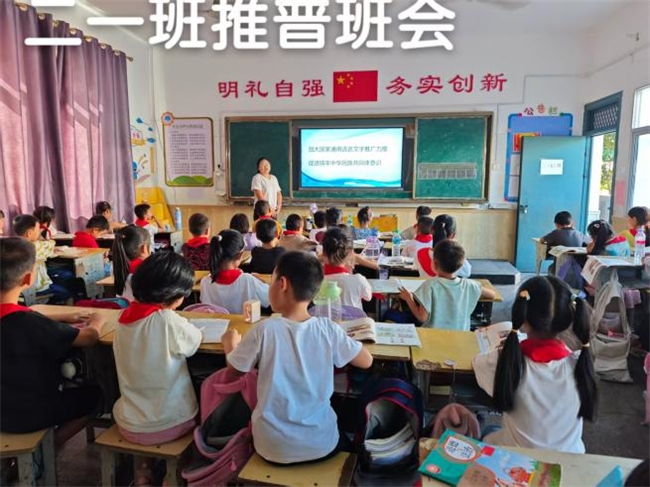 推普周伊始,各班以“加大国家通用语言文字推广力度,促进铸牢中华民族共同体意识”为核心,召开了生动有趣的主题班会。课堂上,老师们通过趣味视频、语言小故事、方言与普通话对比等形式,让同学们明白普通话不仅是交流的工具,更是连接56个民族的文化纽带;同学们积极分享自己学习普通话的小妙招,热烈讨论“说好普通话对民族团结的意义”,一颗颗“说好规范话、争做文明人”的种子在心中悄然种下。