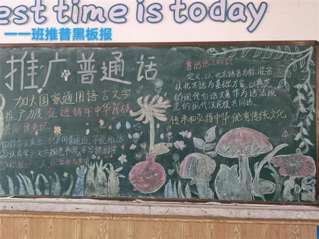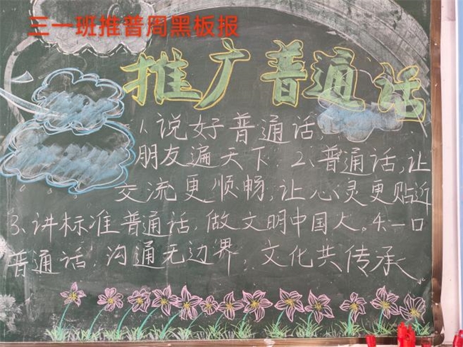 课堂之余,老师们化身“美术设计师”,围绕推普周主题勾勒描绘:苍劲有力的“推广普通话”艺术字占据版面核心,“说标准普通话,写规范汉字”的醒目标语,让黑板报既是直观的宣传阵地,也是生动的语言知识小课堂。