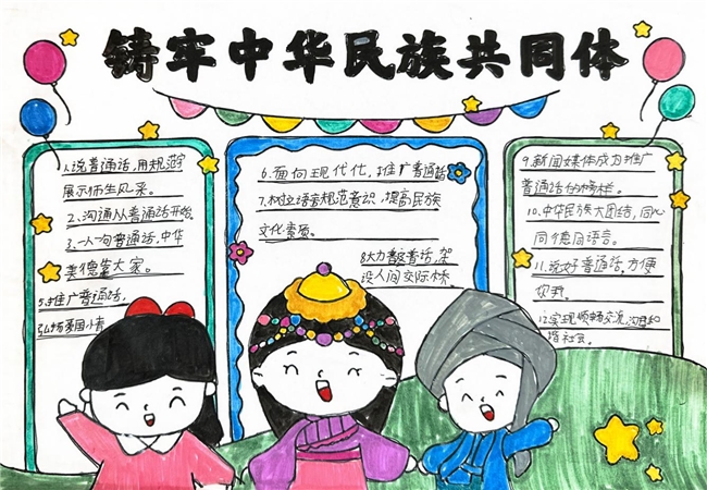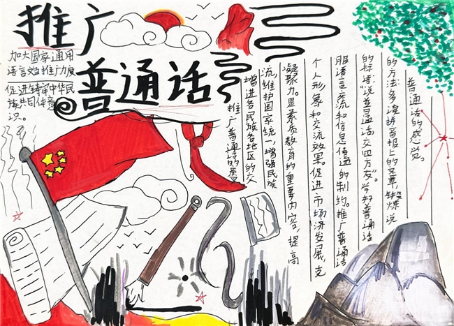 4-6年级的同学们则以手抄报为载体,展开了一场别开生面的创作比赛。同学们拿起画笔,展现多元文化交融之美。每一笔线条都饱含热情,每一种色彩都传递信念,这些作品不仅是推普成果的展示,更是同学们文化自信的表达。