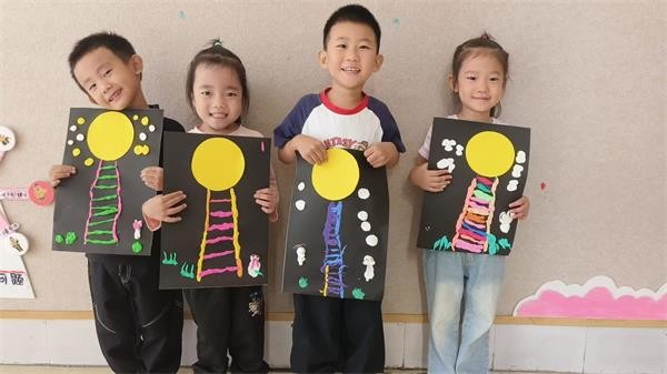 有的孩子制作了“天梯赏月”立体画,黑色卡纸上,黄色的圆月明亮耀眼,彩色的天梯仿佛能直通月宫,周围还点缀着云朵、小花等创意元素。