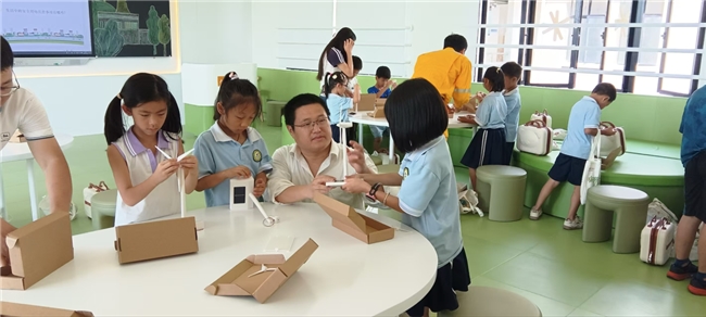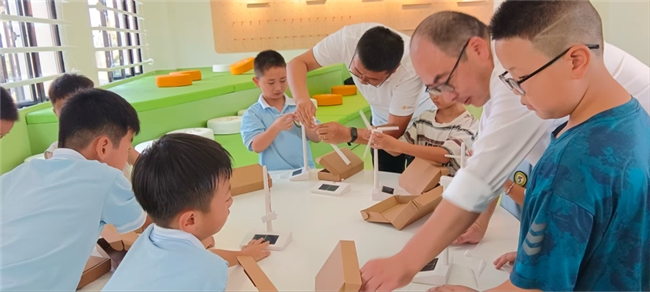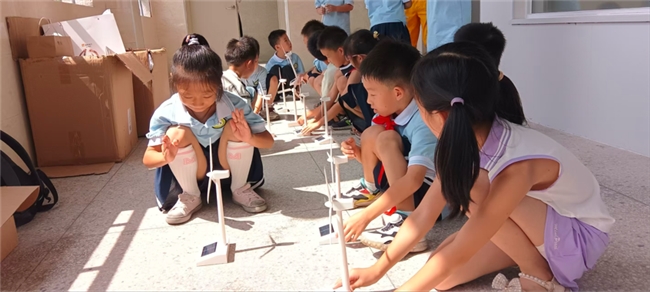 完成组装后,孩子们兴奋地带着自己的作品来到教室外走廊进行测试。当一缕缕阳光照射在太阳能板上,一片片扇叶陆续轻盈转动,走廊上顿时爆发出阵阵惊喜的欢呼。“光能转化为电能”的抽象原理,在这一刻化作孩子们手中真实可感的清凉微风,成功的喜悦如花朵般在每个孩子脸上绽放。