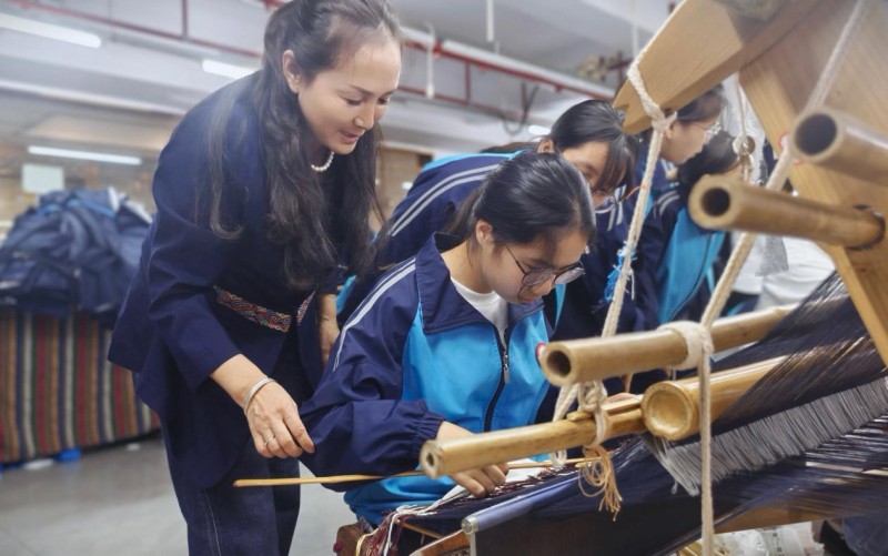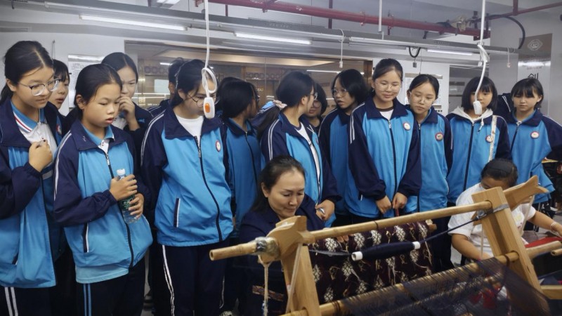 “挑刀要稳,纬线要匀,这门手艺急不得。”在实操环节,叶丽萍手把手指导学生操作木质腰式斜织机。同学们轮流上阵,在“叭呔叭呔”的机杼声中尝试穿插彩线,亲身感受每一寸织锦背后凝聚的匠心。七年级学生李同学看着自己织出的短短几行纹样感慨道:“原来一幅织锦要经过这么多工序,叶老师几十年的坚守太令人敬佩了!”