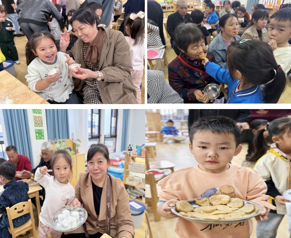 随后,各班开展了丰富多彩的特色手工活动:制作桂花米糕、艾草锤、福字挂饰等。孩子们与祖辈合作完成作品,并将充满祝福的贺卡送给爷爷奶奶,寓意身体健康,福气满满。
