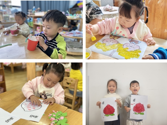 小班宝宝们虽然年龄小,但孝心不减。在老师的帮助下,孩子们亲手制作了寿桃贺卡、纸项链等充满爱意的手工作品。