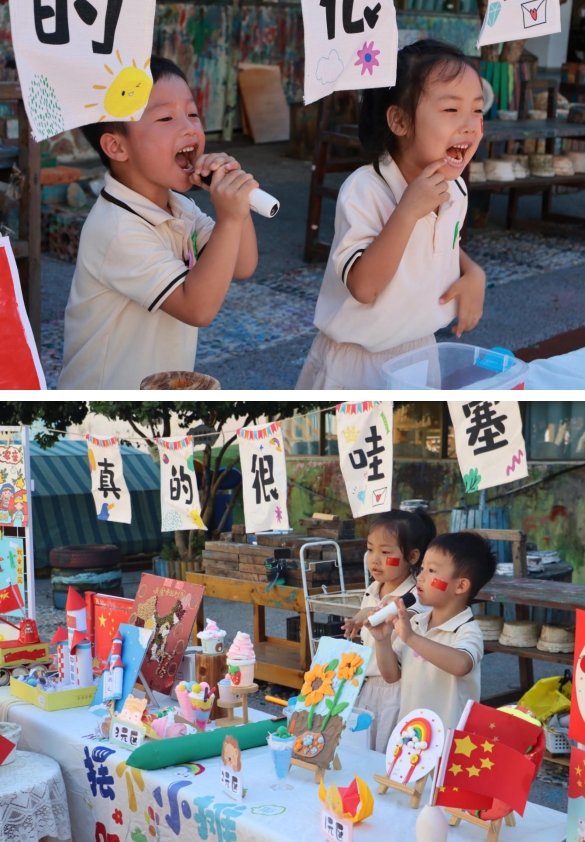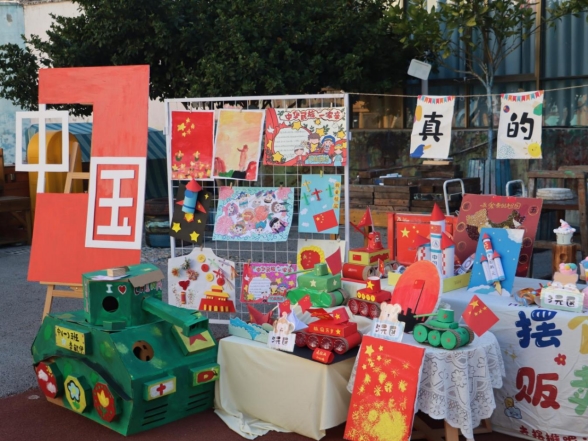 中班的“红色集市”成为园内最热闹的角落。孩子们将前期在美工区创作的红色主题手工作品——绘有五星红旗的帆布包、捏制的“小红军”黏土人偶、剪贴的天安门画作等一一陈列,化身“小小摊主”热情叫卖。稚嫩的吆喝声里,不仅锻炼了沟通与