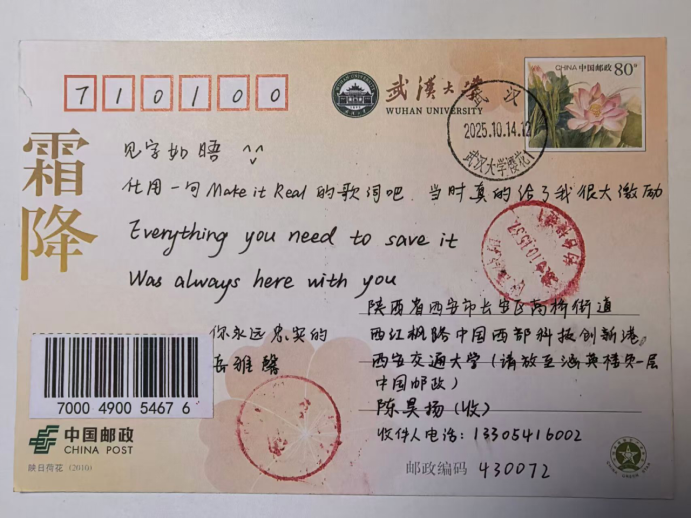 一张明信片,一份牵挂;一次传递,一次精神的弘扬。在此次活动中,工业设计米兰2503团支部的同学们不仅是友谊的使者,更是西迁精神的生动宣讲员。他们以笔为媒,在方寸之间向远方的友人讲述了交大人的宝贵品格,让爱国主义精神随着明信片传递到更多青年心中。我们坚信,这些承载着深厚友谊与家国情怀的明信片,既是青春记忆的独特注脚,更是交大学子展示精神风貌、弘扬西迁精神的生动实践。