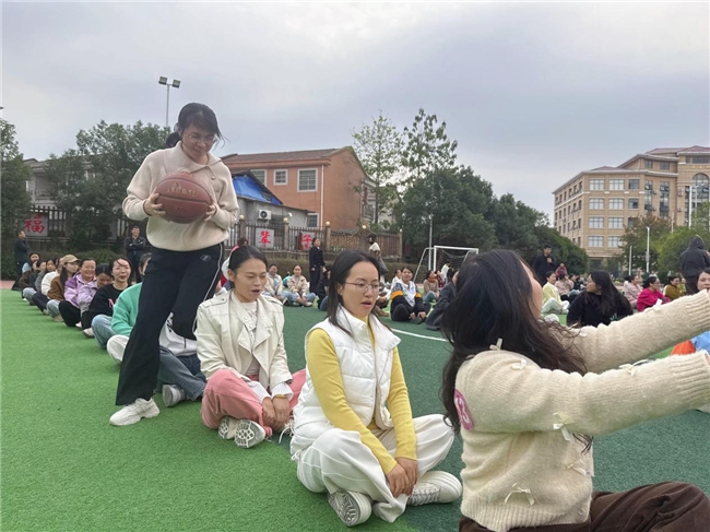 活动当天,操场化身欢乐赛场。传篮球接力赛彰显团队默契:老师们以坐姿排成一列,将篮球依次通过头顶、背部等部位传递,过程中有人巧妙托球、有人默契配合,偶尔的“球滑落”引得全场大笑,却丝毫不减大家的参与热情,最终以完成接力的用时长短评选出优胜队伍。