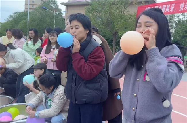 随后开展的吹气球项目中,参赛教师们手持气球专注发力,有的鼓着腮帮稳步充气,有的“速战速决”让气球飞速膨胀,围观同事的加油声与气球充气的“滋滋”声交织成趣,最终以气球充气速度与饱满度决出胜负,赛场洋溢着轻松的竞技氛围。