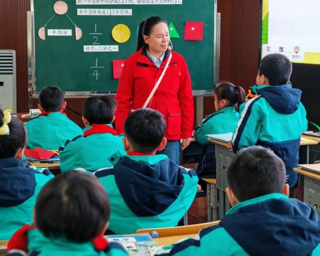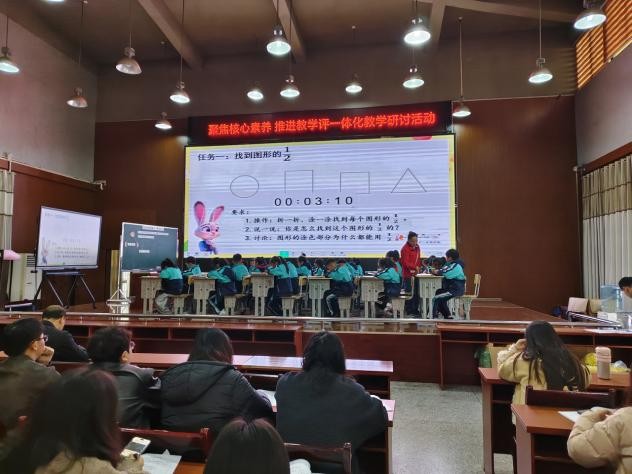 活动开始,彭艳玲老师带来三年级数学《初步认识分数——几分之一》示范课,她以趣味情境导入,引导学生通过折一折、画一画的操作,在直观体验中建立分数概念,课堂上“教-学-评”自然融合,学生的抽象思维得到有效培养。