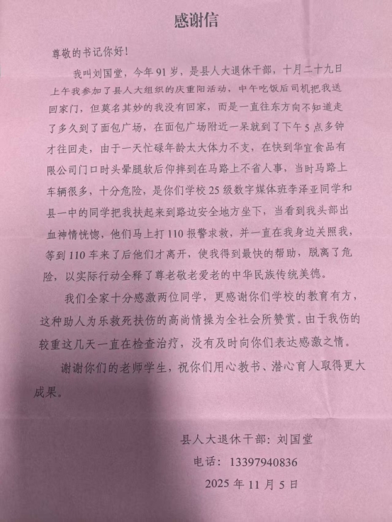 近日,资溪中等专业学校收到了一封来自资溪县人大退休干部刘国堂的感谢信。信中详细讲述了资溪中等专业学校 25 级数字媒体班学生李泽亚挺身而出,救助自己的暖心事迹,字里行间满是对李泽亚同学的感激之情,更对学校立德树人的教育成果给予了高度赞扬。