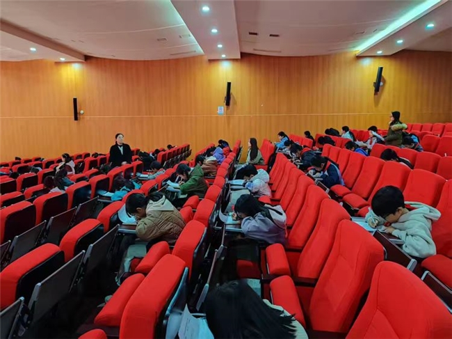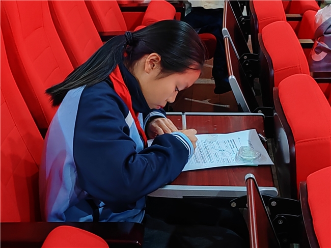 比赛当天,低年级学生身着特色服装,配合音乐和道具完成表演;高年级学生则在书面测试中专注作答,展示类项目的视频播放环节更是赢得阵阵掌声。
