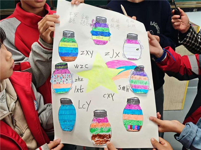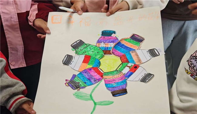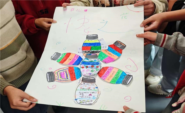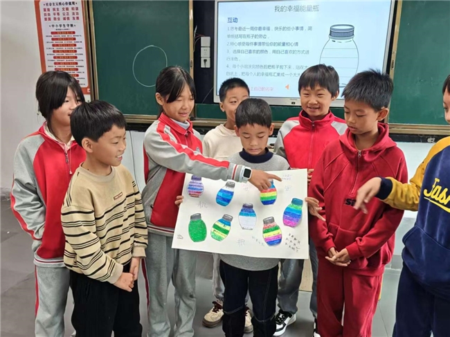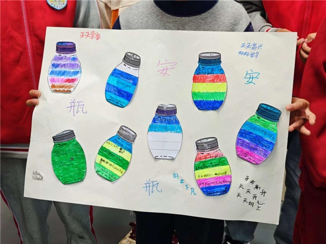 幸福能量瓶创作:学生们思考近一周的幸福小事,用色彩填充“能量瓶”并标注事件,以绘画形式具象化幸福体验;