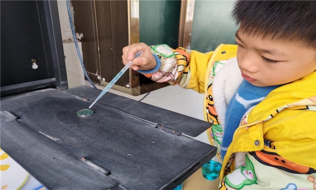 “会跳舞的水滴”:学生利用滴管将水滴在蜡纸、树叶、硬币等不同材质的表面上,观察水滴在不同表面的形状(是否成球),感受水的表面张力。