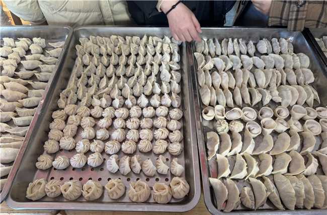 活动当天,食堂早早准备好了面团、饺皮和多种馅料。令人惊喜的是,学校不仅准备了南方常见的鲜肉馅,还特意加入了北方风味的白菜猪肉馅、韭菜鸡蛋馅,让这场活动平添了一份南北交融的趣味。许多来自本地、惯吃米食的南方老师,看着擀面杖和圆圆的饺皮,既感新奇又跃跃欲试。