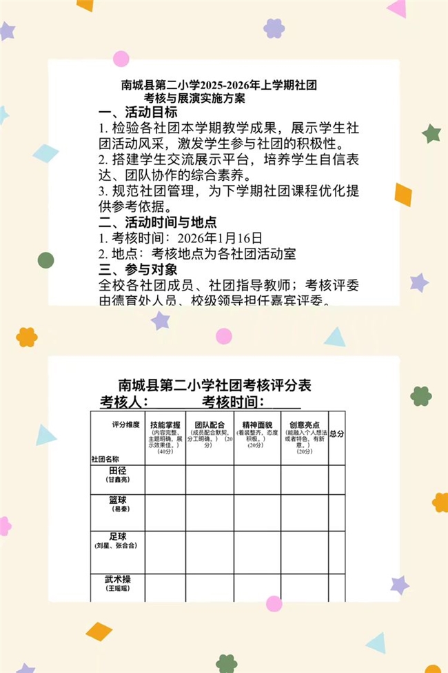 冬日的阳光轻洒南城县第二小学的校园,彩旗招展,欢笑声与喝彩声交织成动人的旋律。2025-2026学年度社团展演如约启幕,这场以“多元成长,微笑绽放”为主题的盛会,将学校体育类、音乐艺术类、美术艺术类、科技类等社团的风采尽数展现。从赛场的热血拼搏到艺术的诗意表达,从科技的奇思妙想到非遗的匠心传承,孩子们用一学期的积淀,在舞台上书写着属于自己的成长故事。