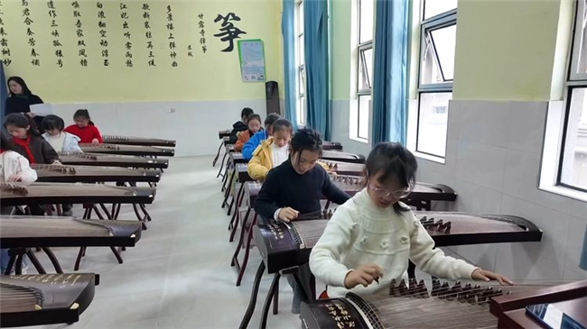弦上小知音:同学们在古筝教室拨弦演奏,古朴的筝音婉转悠扬,让现场观众沉浸在传统民乐的独特韵味中。
