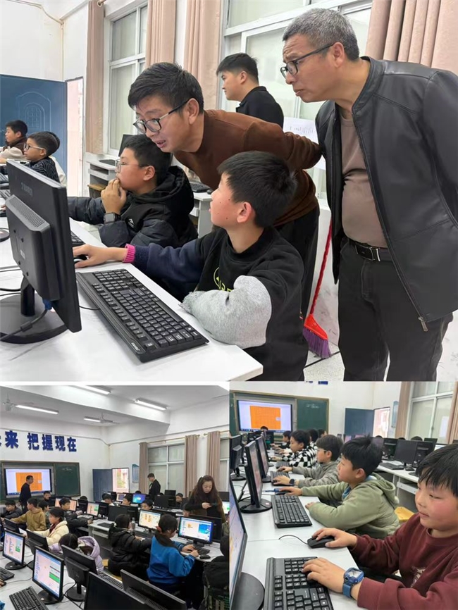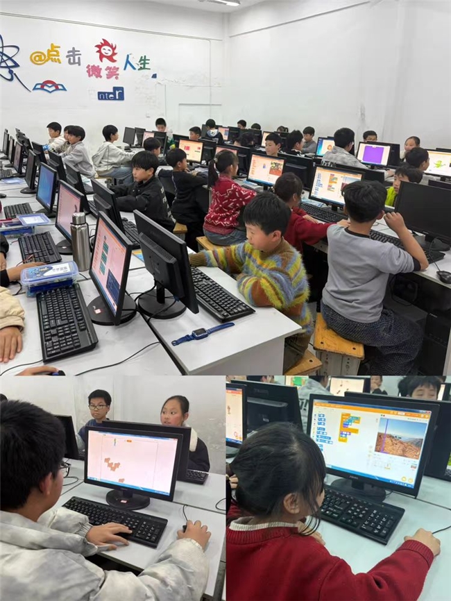 Scratch编程工坊:同学在计算机室展示自己设计的小游戏、动画,通过可视化编程将创意变为现实,体验着科创的乐趣。