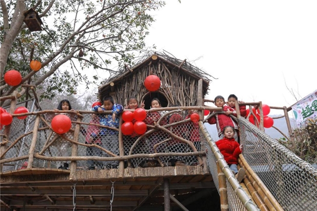 揭牌结束,孩子们便迫不及待欢呼着奔向山谷园,主动化身“小小探险家”开启探索之旅,山谷畅玩即刻拉开序幕。孩子们自主骑行穿梭林间,灵活攀爬树屋、蹦跳于田埂间,捡拾落叶、石子进行创作,追逐嬉闹声此起彼伏,肆意释放童真。生活区内烟火缭绕,孩子们协作磨浆、烤肉,鼻尖萦绕香气,脸上满是劳动的欢愉。