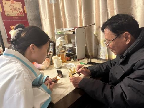 1月20日,团队走进合浦角雕非遗传承人家中,继续深入学习角雕技艺。成员们参观了传承人珍藏的历代角雕作品,进一步了解角雕工艺的发展脉络与作品创作理念,在传承人的专业指导下动手体验角雕基础制作,掌握了工艺要点与安全操作规范。随后,团队还组织当地儿童开展角雕体验活动,对复杂的角雕工艺进行简化优化,现场讲解角雕非遗知识、示范基础操作方法,让孩子们近距离接触角雕技艺。